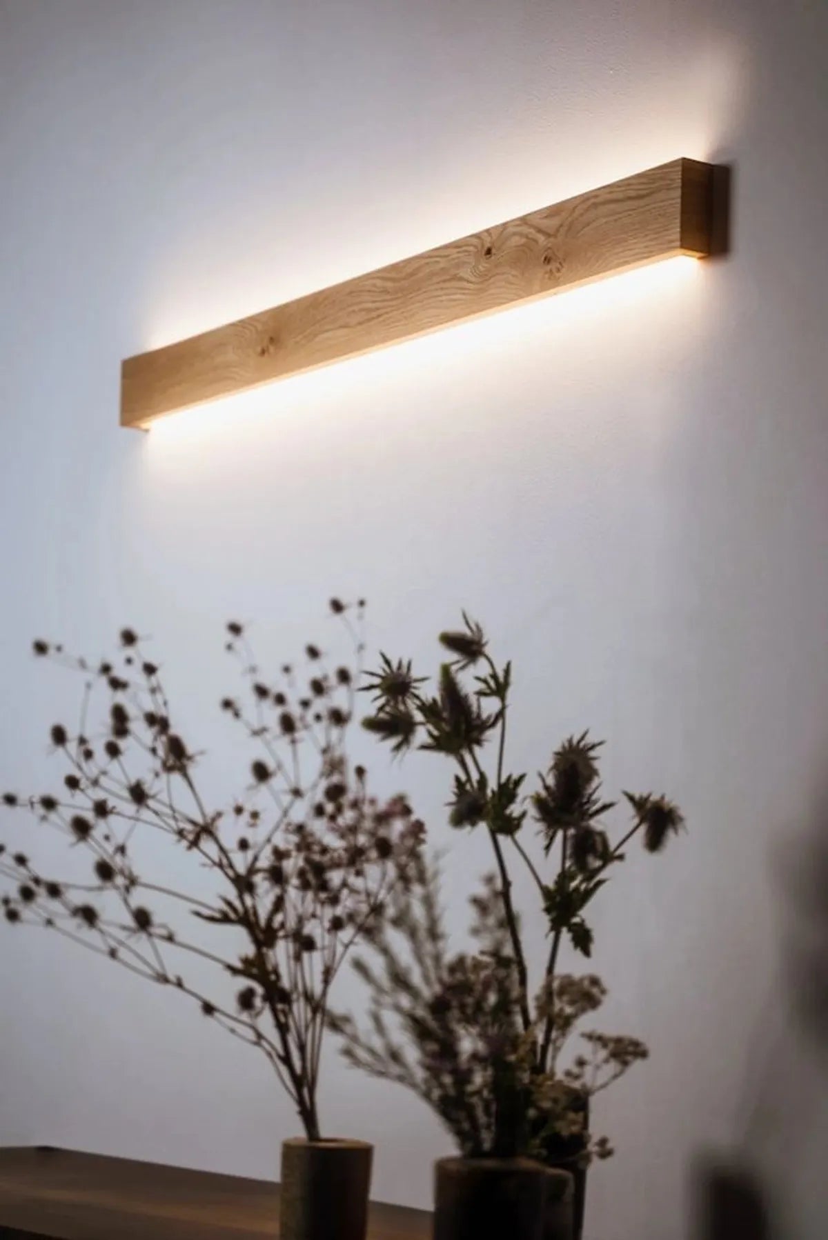 Handcrafted from solid natural wood, this sleek vertical wall light emits a soft ambient LED glow that gently washes the wall with warm light, creating a calm and sophisticated atmosphere.